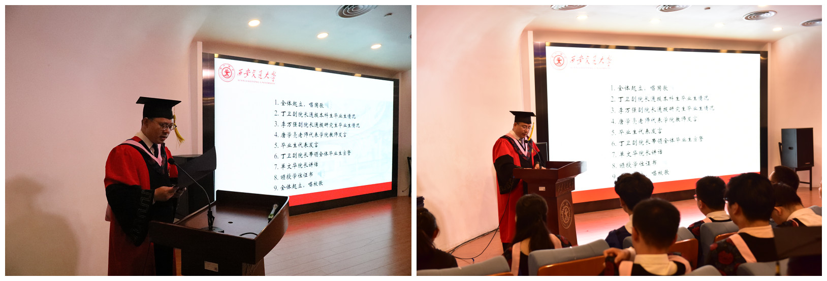 典礼上,单文华院长向法学院全体2021届毕业生致辞,他代表学院祝贺同学们圆满完成学业,感谢同学们在就读期间对学院发展所给予的大力支持,同时感谢言传身教,辛勤耕耘,培育优秀人才的全体老师。他指出,真正的法治是川流不息的人类生活生产中具体而鲜活的命题,法治是不断演进的过程。他希望毕业生能切实践行法治,不论将来从事什么工作、参与什么活动,努力尝试以法治的思维和法治的方式来应对,养成法治的习惯。他期望西安交通大学的法科毕业生能够创造第一等的事业,研究第一等的学问,砥砺第一等的品行,造就第一等的人才,为世界之光!最后,他欢迎大家常回母校看看!