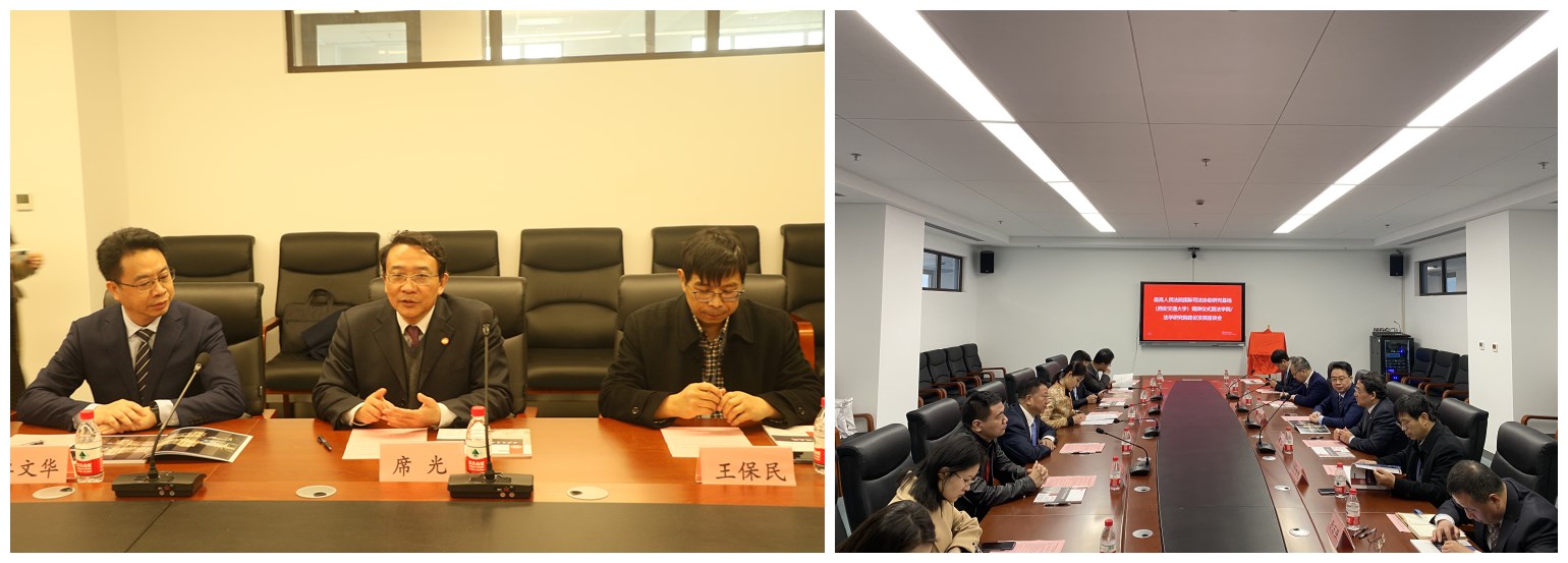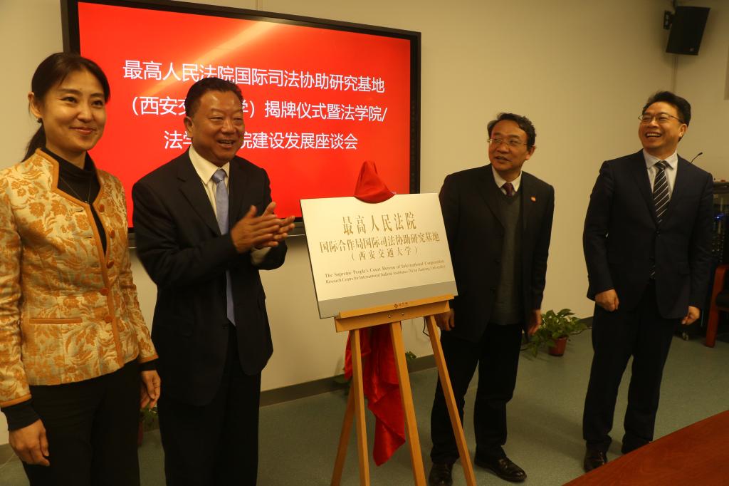 4月8日,在西安交通大学迎来建校125周年暨迁校65周年之际,最高人民法院国际合作局与西安交通大学合作共建最高人民法院国际合作局国际司法协助研究基地(西安交通大学)揭牌仪式暨法学院建设发展座谈会在创新港法学研究院举行。海南省人民检察院前检察长路志强、最高人民法院国际合作局局长兼第六巡回法庭第一副庭长高晓力、西安交通大学副校长席光、法学院兼国际教育学院院长单文华共同为研究基地揭牌。单文华院长主持会议。