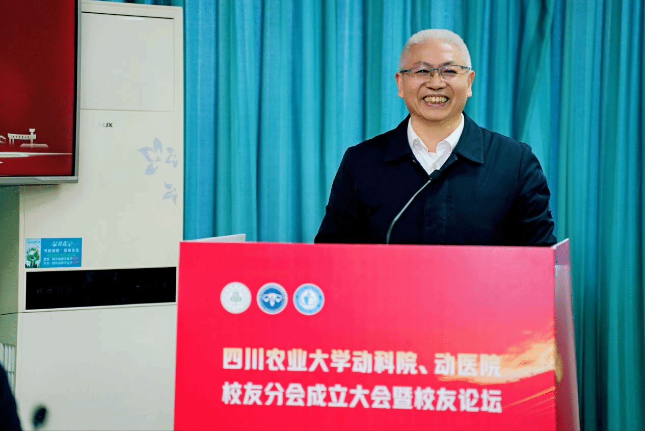 吴德代表学校向参加大会的各位领导、嘉宾和校友表示热烈欢迎。他在致辞中回顾了学校的发展历程,并指出动物科技学院、动物医学院百年办学历史悠久、学科特色鲜明、在动物遗传育种与健康养殖、疫病防控与兽药创新等领域取得了丰硕的教学科研成果,为国家畜牧兽医事业和乡村振兴提供了坚实支撑。他强调,当前正值国家全面推进乡村振兴、加快建设农业强国的关键时期,畜牧兽医事业面临提质增效、绿色发展与公共卫生安全等重要任务,学校也处于推进新一轮“双一流”建设和高质量发展的重要阶段,希望两院成立校友分会,凝聚校友力量、共担时代使命、不断弘扬“川农大精神”,谱写高质量发展新篇章。