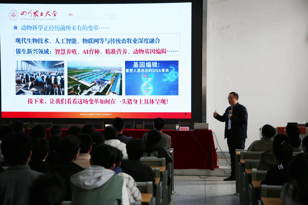 活动首站走进四川省安岳中学,校招生就业处副主任刘思妮为学生作招生宣讲与职业生涯规划指导,学院动物科学系主任曾长军教授作了《百廿动科 相“岳”未来》专题讲座,讲座内容紧扣高校人才培养与中学生成长发展需求,既有前沿学科视野的拓展,也有务实精准的升学引导,现场互动热烈,气氛活跃,进一步激发了青年学子投身现代农业与生命科学领域的兴趣与志向,安岳中学300余名优秀学生代表参加。