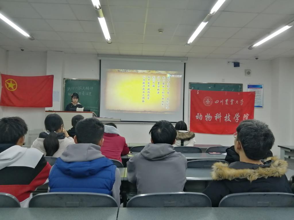 12月1日晚,动物科技学院团委组织部在第四教学楼B区405教室,开展主题团校第四讲“践行川农大精神,做优秀共青团员”,本次团校主讲人为大一年级组织部成员周茂林。