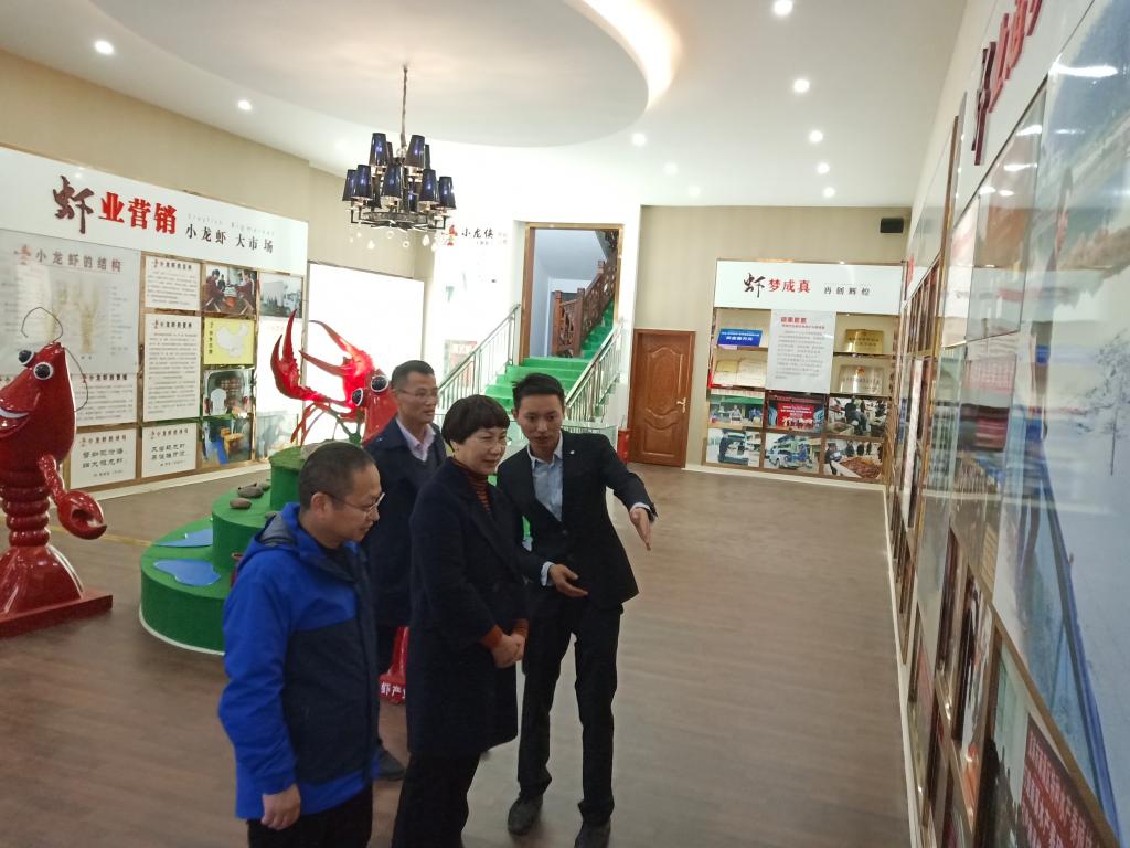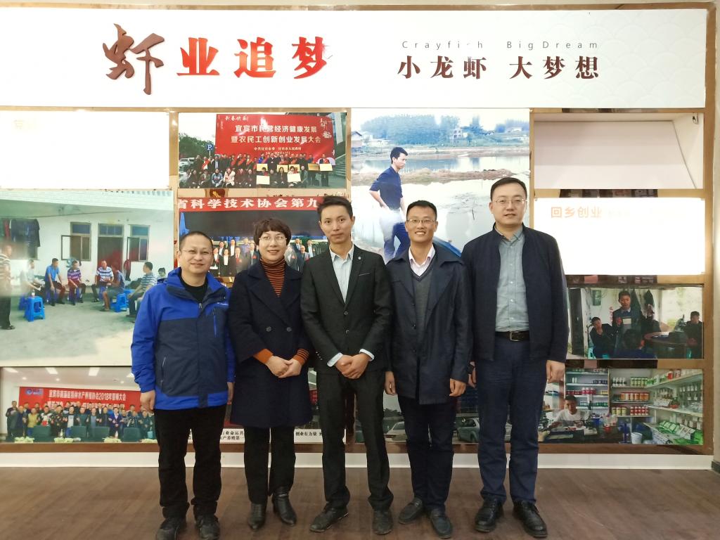 付瑞琼一行首先去宜宾南溪区看望了2019年四川返乡青年创业创新领军人才、受到央视《远方的家》专题报道、水产2010级校友杨海。杨海带老师们参观了他的高品质小龙虾养殖基地,并介绍了5年来他利用自己在学校所学到知识并大胆创新,通过反复的试验、摸索和实践,创建了适应当地气候和土壤特点的高品质小龙虾养殖新技术,筹建了南溪龙虾产业文化馆,现已建立1200多亩的小龙虾养殖基地,高品质的小龙虾每天源源不断的运送到北上广深等一线城市的高端消费市场。同时,他自办养殖示范基地,通过“技术下乡、产业兴村、解决就业、创新模式”等四个方面助力当地精准扶贫工作,举办技术讲座200余场,培训养殖人员10000余人次,带动近100户贫困户脱贫。他倡导成立了南溪水产养殖协会并当选会长,目前协会共有6300余亩小龙虾养殖规模,年产量达到240万斤,年产值达到7200万元。