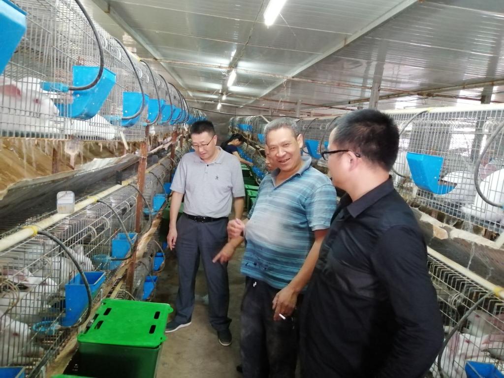培训会后,赖教授一行前往四川华恒农业有限公司毛浴镇肉兔养殖基地和养殖户家中进行现场技术指导,对基地和养殖户的种兔、育肥兔养殖情况、育种记录、饲料保存和防疫程序等进行了全面巡查,针对新冠疫情以来肉兔养殖、销售、无抗养殖等当前肉兔养殖中的热点问题进行了调研,对现场发现的问题提出了建设性意见。