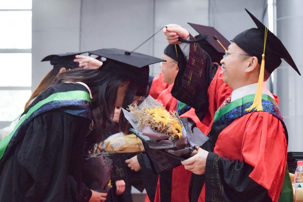 李明洲宣读了授位决议。毕业生们依次分组上台接受授位。