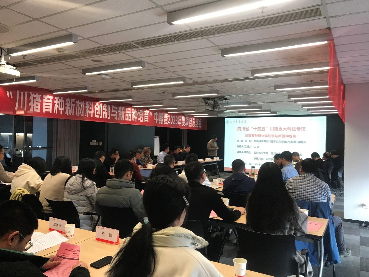 1月12日,我校动物科技学院曾长军教授担任首席专家的四川省“十四五”川猪重大科技专项“川猪育种新材料创制与新品种培育”项目中期暨2023年度总结会在铁骑力士食品有限责任公司成都办事处召开。四川省科学技术厅重大专项处处长蔡红,四川省农业农村厅种业发展处副处长余协中,四川省农村科技发展中心周华强副主任等3位专家组成项目咨询专家组。项目责任联系专家四川省畜牧科学研究院养猪所所长吕学斌莅临会议跟踪指导。四川省畜牧总站副站长李强,四川省畜牧科学研究院党委书记何志平,我校科技处副处长杜俊波作为项目特邀咨询专家参会。来自四川农业大学、四川省畜牧总站、四川省畜牧科学研究院、铁骑力士食品有限责任公司、绵阳明兴农业科技开发有限公司、邛崃市嘉林生态农场、巴中市巴山牧业股份有限公司、四川德康农牧食品集团股份有限公司等8家项目合作单位的20余位相关研究人员参加了此次会议。