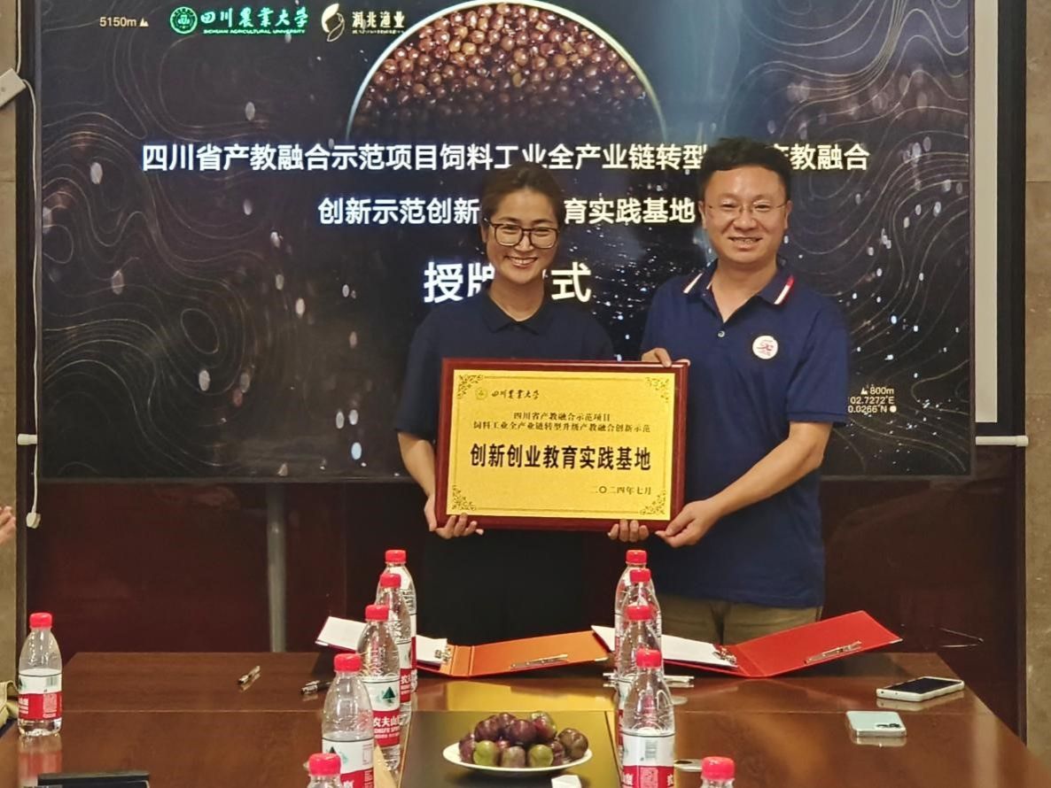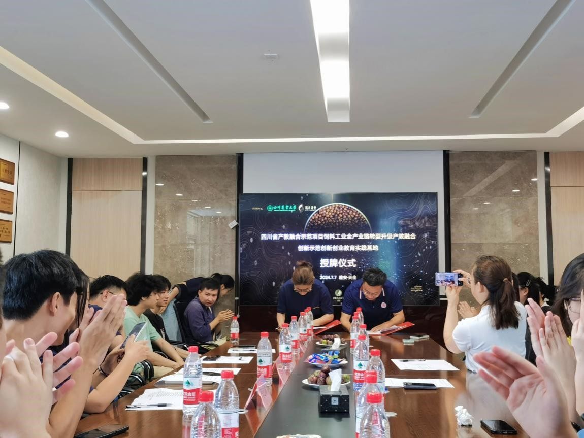 在与会人员的共同见证下,双方签订了院企合作协议并为四川省产教融合示范项目饲料工业全产业链转型升级产教融合创新示范“创新创业教育实践基地”揭牌。