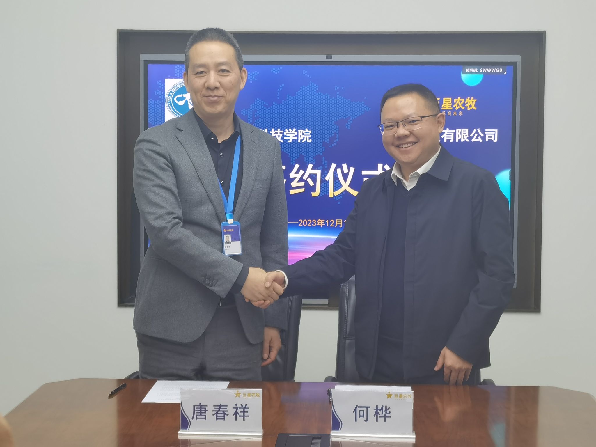 为进一步深化产教融合,探索人才培养新模式,拓宽学生实习和就业渠道,12月1日,动物科技学院党委书记何桦率队前往巨星农牧签署就业实习基地协议。巨星农牧有限公司总经理唐春祥、人力资源总监刘泓晖、招聘配置经理颜晓玲,动物科技学院党委书记何桦、动物科学系主任张明等参加座谈签约仪式。