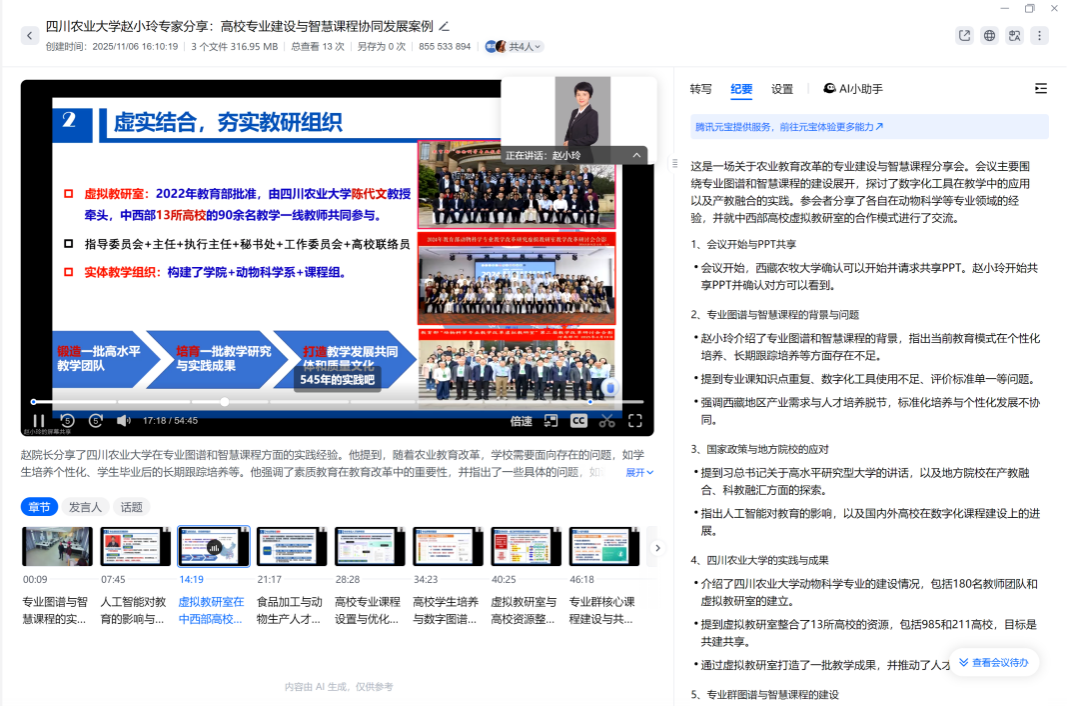 赵小玲教授分享了四川农业大学动物科技学院在专业图谱和智慧课程方面的实践经验。她强调了素质教育在教育改革中的重要性,并指出了一些具体的问题,如课程知识点重复、数字化工具应用不足等,分析了国家对于高水平研究型大学的要求以及地方院校在产教融合、科教融合方面的探索。