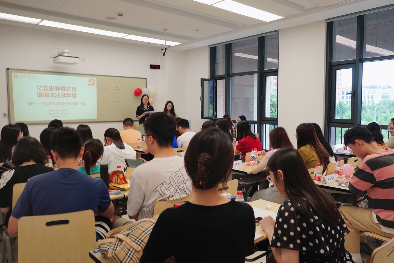 6月23日,在庆祝中国共产党成立100周年之际,法学院党总支在创新港举办“迎七一”党史及法律知识竞赛活动。本次知识竞赛以“忆党史峥嵘岁月 谱南洋法脉华章”为主题,涵盖了百年党史、新中国史、改革开放史、社会主义发展史以及交大校史、法律史等相关内容。活动由法学院硕0173党支部承办,硕0173党支部书记宫雨、支部党员林雨晴担任主持。法学院党总支委员、学生工作专职委员张乃钟出席活动。