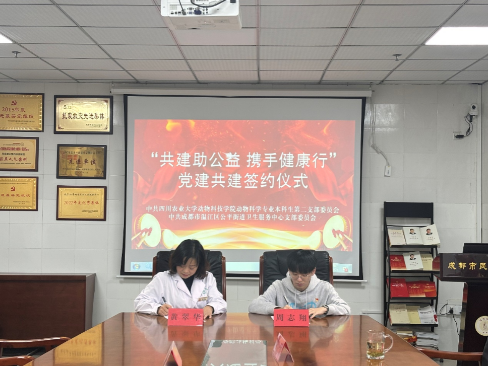 3月27日下午,动科院动物科学专业本科生第二党支部与温江区公平街道卫生服务中心党支部签订党建共建协议。公平街道卫生服务中心主任、党支部书记黄翠华,分管主任、党支部宣传委员敬希伟,医疗分管主任、支部组织委员徐璇,动科院党委办副主任、团委副书记舒正悦,动科院动物科学专业本科生第二党支部书记周志翔,动科院党委办相关老师、学生志愿者代表,公平街道卫生服务中心医生代表等20余人参加本次活动。