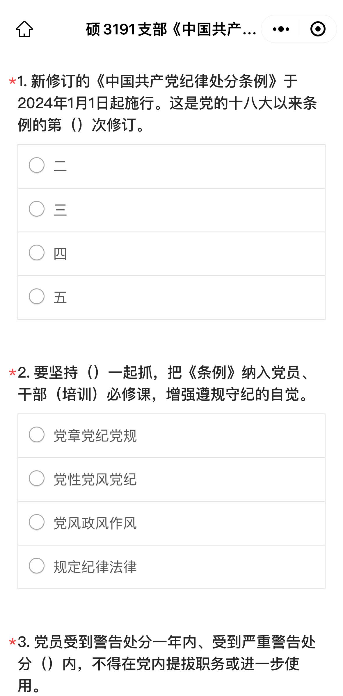 首先,党支部书记刘芮言介绍了《条例》的修订情况。新修订的《中国共产党纪律处分条例》在总结实践经验基础上,与时俱进完善纪律规范,与2018年《条例》相比,新增16条,修改76条,进一步扎紧织密制度笼子,为全面加强党的纪律建设提供了重要遵循。之后,刘芮言带领支部内其他同志对《条例》第二章违纪与纪律处分部分进行了解读学习,并观看了党风党纪警示教育片《心渊》。最后,为巩固学习效果,支部通过问卷星进行了《中国共产党纪律处分条例》知识答题测试,党支部内各位学生党员测试结果优良,本次党日活动学习成果显著。
