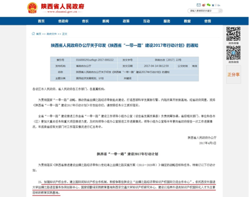 陕西省人民政府办公厅日前印发了《陕西省“一带一路”建设2017年行动计划》,明确指出要加强知识产权合作,建立国际间知识产权合作机制,积极争取在陕设立‘丝绸之路经济带知识产权国际交流合作中心’,依托西安交通大学知识产权研究中心、西安外国语大学丝绸之路语言服务协同创新中心和国家级翻译实践教育基地,建设以培养外语类知识产权国际化人才为主要目标的教育实践基地。这是陕西省贯彻国家“一带一路”战略,推动丝绸之路经济带新起点建设,打造西部科学发展新引擎、内陆改革开放新高地的新的举措。