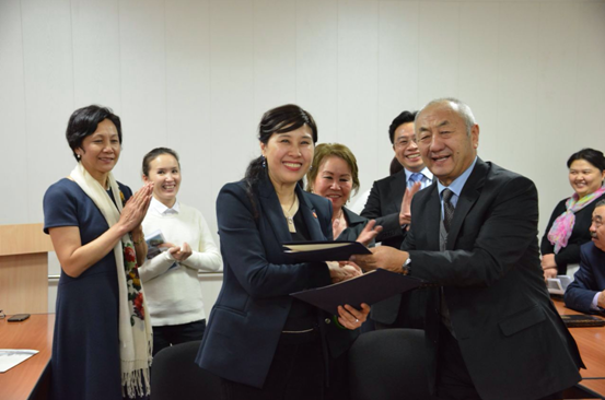 俄-塔斯拉夫大学Salikhov Nurali Nazarovich校长在协议签署仪式上表示,希望加深丝绸之路经济带高校之间的合作,祝愿两校之间的合作如同丝绸般柔软、和平。哈国立大学Burkitbayev Mukhambetkali副校长则愉快地回顾了新丝绸之路大学联盟成立以来两校的友好合作,他表示新丝绸之路大学联盟的成立为双方合作搭建了良好的平台,两校学生也共同参加了今年6月份开启的“2015丝路文创暑期课程”。