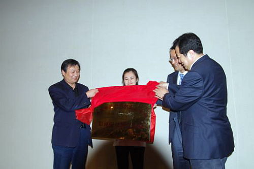 (蒋庄德副校长、王勇总经理和李梦泽调研员为影视产权研究基地揭牌)