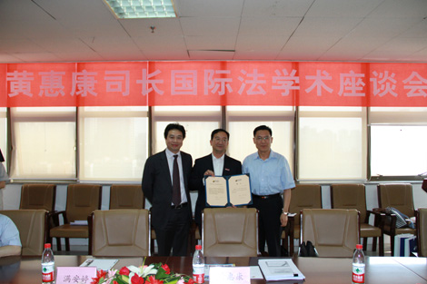 2012年5月26日,外交部条约法律司黄惠康司长“郑和研究员”授聘仪式暨国际法学术座谈会在法学院910会议室举行。西安交通大学党委常务副书记王小力教授、法学院党总支书记彭沪生老师、对外经济贸易大学石静霞教授以及丝绸之路国际法与比较法研究所骨干教师和学生代表参加了授聘仪式和座谈会。会议由法学院院长兼丝绸之路国际法与比较法研究所所长单文华教授主持。
