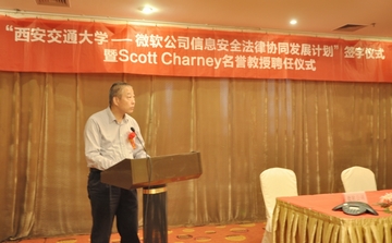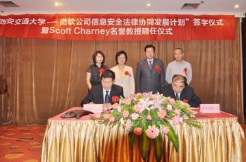 6月12日,“西安交通大学—微软公司信息安全法律协同发展计划签字仪式暨斯科特•查尼名誉教授聘任仪式”在西安交大举行,西安交大副校长蒋庄德教授出席仪式并讲话。西安交大科研院副院长、人文社科处处长贾毅华,法学院党总支书记彭沪生,信息安全法律研究中心主任马民虎及微信息安全法律研究中心主任马民虎及微软公司可信赖计算部总经理陈静、微软公司资深安全技术经理陈恺、微软公司资深安全技术经理薛峰等参加仪式。微软全球副总裁斯科特•查尼(Scott Charney)受聘为西安交大名誉教授,双方还签署了“西安交通大学—微软公司信息安全法律协同发展计划”。