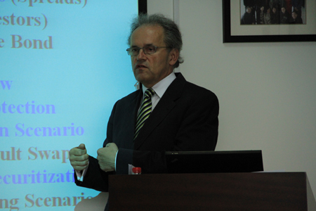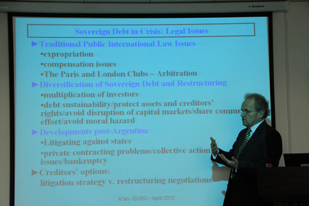 4月16日下午,Kulms博士为法学院师生带来题为The Eurozone Debt Crisis and Private Creditors: From Argentina to Greece(欧元区债务危机和私人债权人:从阿根廷到希腊)的讲座。Kulms博士首先分析了欧元区债务危机的成因,然后在借鉴阿根廷债务危机经验的基础上,从市场交易的进路分析主权债务合同的对策,最后从欧洲央行作用的角度讨论希腊债务重组问题。