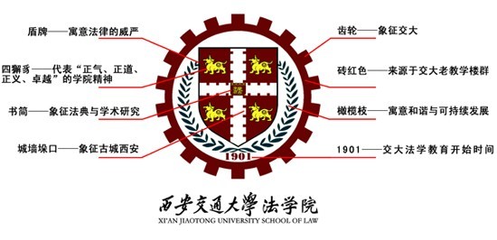 2010年10月25日,在法学院全体师生的见证下,西安交通大学校长、中国工程院院士郑南宁教授与教育部法学教育指导委员会主任、吉林省高级人民法院院长兼党组书记张文显教授共同为法学院院徽揭幕并挂牌。院徽设计庄重大方、色彩明快、寓意深广。现将院徽的基本设计含义公布如下: