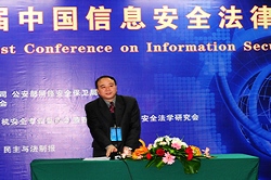 严明主任首先代表公安部第一研究所及中国计算机安全专业委员会对大会的召开表示热烈的祝贺。他指出,随着信息化进程在各个领域的发展,信息安全已经成为世界各国普遍给予极大重视的一个战略问题,成为国家综合安全不可缺少的重要组成部分。加强信息安全工作迫在眉睫。信息安全的法律、法制建设已经成为打击网络犯罪的重要工具。进入21世界,信息安全的建设更加迫切,尽管我国已制定多部法律对计算机犯罪和信息安全系统的保护提出了具体的要求,但仍不容乐观。近年来,我国信息安全领域面临许多新技术、新应用的挑战,信息网络安全的建设仍任重而道远。期待西安交通大学法学院和研究中心为我国信息安全法的研究做出更大的贡献。