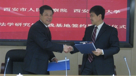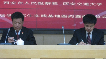 西安交通大学法学研究生实践基地签约暨揭牌仪式,于2009年11月25日上午10点,在西安市人民检察院新址办公大楼内举行。“西安交通大学法学研究生实践基地”是西安交通大学和西安市人民检察院,教学与实践相结合的平台,其宗旨在于提升我校法学研究生的法律实践能力,并强化检察院司法人才的理论素养。