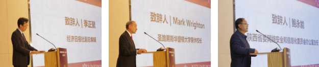 经济日报社副总编季正聚、圣路易斯华盛顿大学荣休校长Mark Wrighton、陕西省委网信办主任鲍永能等分别致辞,他们对西安交通大学人文社科板块入驻中国西部创新港表示祝贺;对西安交大始终坚持“扎根西部、服务国家、世界一流”的办学定位,以中国特色、实现世界一流为目标,以立德树人为根本,在培养国家栋梁、推动科技进步、服务社会发展、实现文化创新、促进国际交流等方面作出突出贡献表示肯定;对西安交大人文社科研究院再担新使命、再踏新征程、再创新辉煌表示祝福。