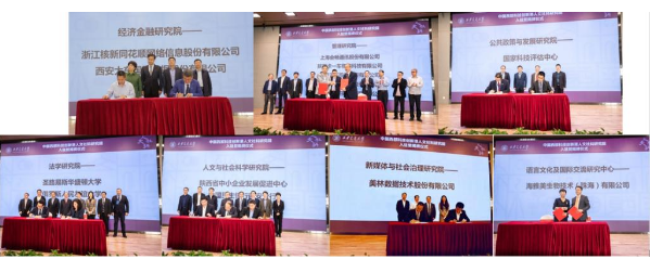 入驻仪式上,西安交通大学各研究院与国家科技评估中心、陕西省工信厅、中国民生银行西安分行、圣路易斯华盛顿大学、阿里巴巴集团、浙江核新同花顺网络信息股份有限公司、陕西省外经贸实业集团有限公司等政府、高校和企业签订了十余项合作协议,围绕科学研究、人才培养等内容展开实质性的深入合作。