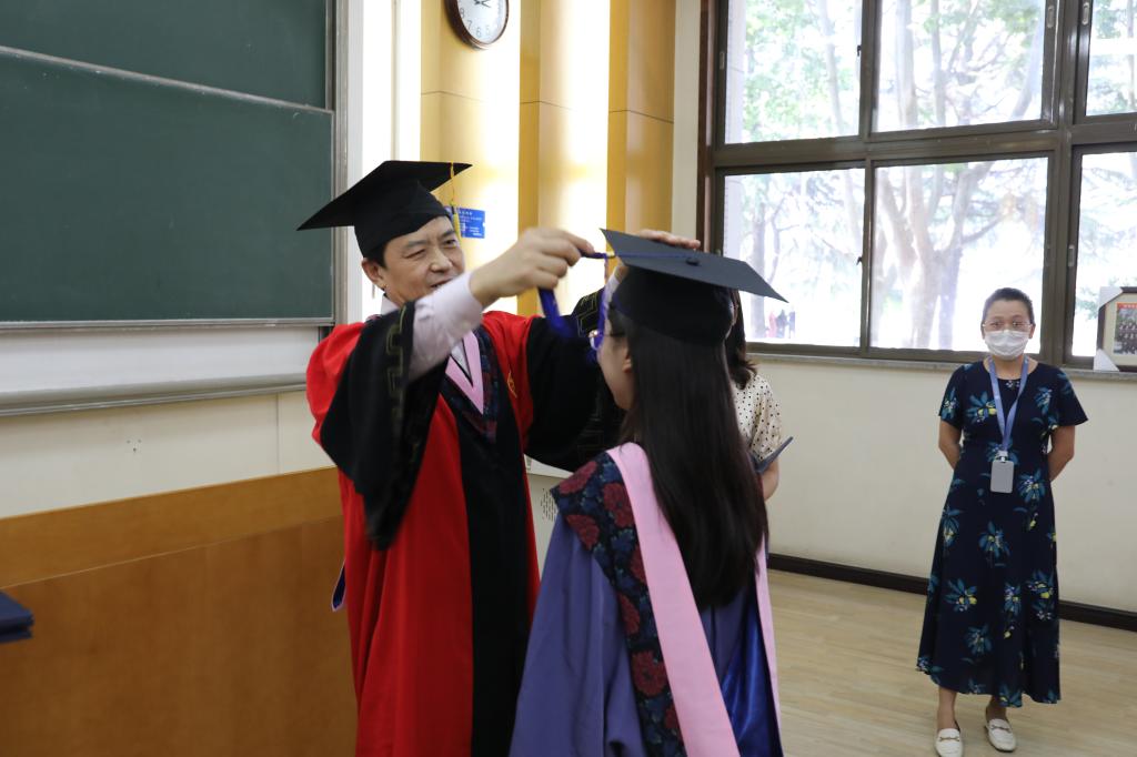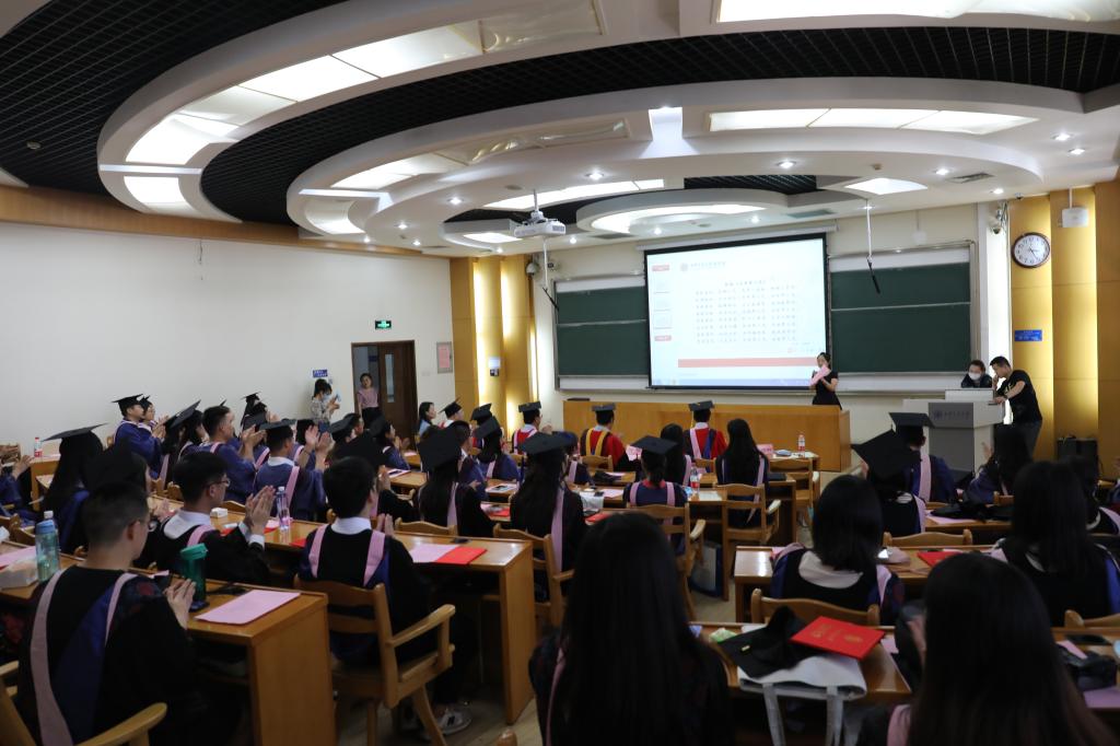 在师生代表发言环节,李晓鸣老师以微课的形式启发毕业生回顾交大求学期间记忆深刻的事情,她希望毕业生们在学校不仅学到了扎实的专业知识,更能带着求知的欲望、坚韧的品格、心中的正义和交大的爱国主义传统,走向社会、回馈社会。本科毕业生于翠洁和硕士毕业生徐佳文对学校和老师们的辛勤培养表达了深深的感谢,他们回顾在交大的学习时光,以自己的成长经历诠释了对“三正一卓”院训的理解。
