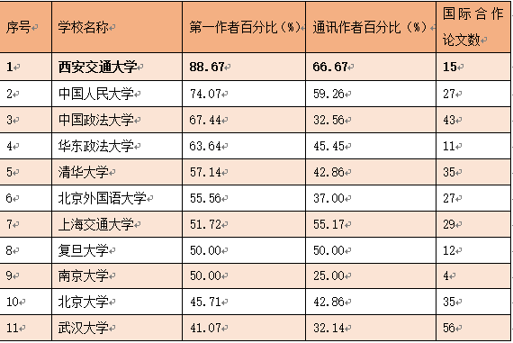 (数据和表格信息来源:中国政法大学“法治科学计量与评价中心”官方微信公众号,原文题目为《我国首批涉外法律人才教育培养基地建设情况——国际合作论文分析》)