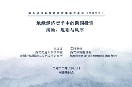 2022年5月8日,第五届国际投资法青年学者论坛顺利线上举行。本届论坛以“地缘经济竞争中的跨国投资:风险、规则与秩序”为主题,由西安交通大学法学院丝绸之路国际法与比较法研究所主办,并由西安仲裁委员会、Foundation for Law and International Affairs Review支持。
