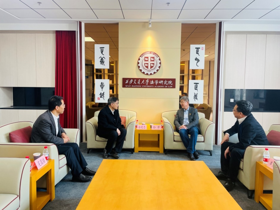 孙早代表学校对孙宪忠教授来访表示欢迎,感谢他长期关心西安交大法学学科建设,并简要介绍了学校未来规划、创新港建设发展情况,期待孙宪忠教授进一步关注、支持西安交大发展。孙宪忠充分肯定了西安交大近年来发展成果,表示将会继续支持学校和法学学科建设发展。单文华表示,期待未来双方进一步展开更多学术交流合作,携手为法治中国建设作出更大贡献。