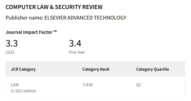 根据科睿唯安最新发布的2023年期刊引证报告(Journal Citation Reports, JCR),《计算机法律与安全评论》位列SSCI的Q1区序列,在共计430本SSCI法学刊物中位列第7位。