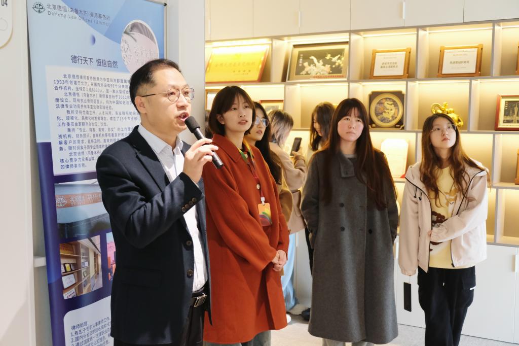 随后,德恒西咸律所执行主任范玉华律师带领法学院师生参观了律所的办公环境,如合伙人办公室、西北地区共享办公室、模拟法庭等,以便广大学子可以更加直观地感受律师职业的工作日常和专业氛围。范律师介绍了德恒律师事务所的成立时间、现有机构数量,以及在党建工作和法律服务方面的全面布局和成就。在党建工作方面,他指出德恒律所坚持“分所开在哪里,党支部就建在哪里”的原则,以党建促所建,明确党建在业务发展中的引领作用,荣获“全国先进党组织”的荣誉称号;在法律服务方面,他指出德恒律所服务“一带一路”等国家重要战略项目,为国家发展贡献力量。