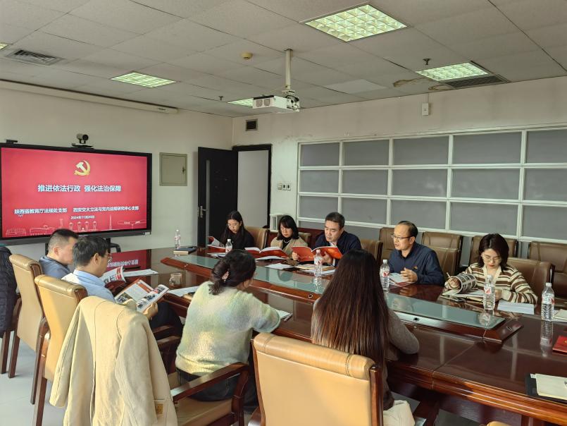 为深入学习贯彻党的二十届三中全会精神,进一步加强党支部之间的交流与合作,11月20日下午,省教育厅法规处党支部一行与法学院立法与党内法规研究中心党支部在兴庆校区主楼E910会议室联合开展了“推进依法行政强化法治保障”的主题党日活动。省教育厅法规处支部处长付仲锋、副处长张世飞等一行七人,和西安交通大学法学院党委书记王保民教授、立法与党内法规研究中心支部书记杜军强老师等立法支部师生代表共同参加了此次活动,会议由支部书记杜军强老师主持。