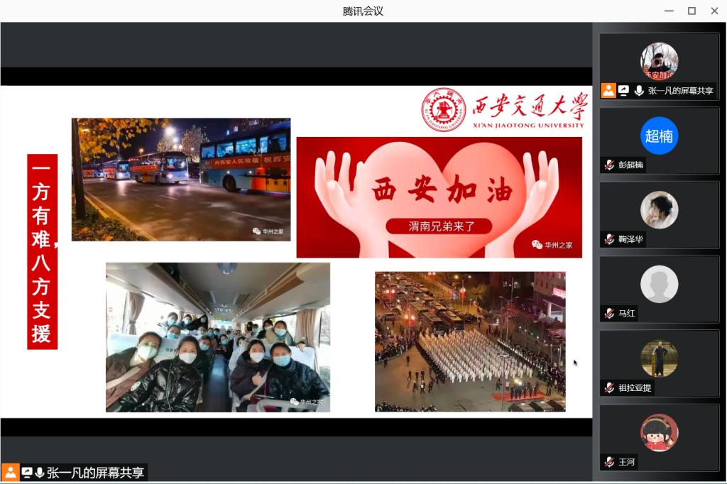 会议第二项,校微宣讲团成员杨婧同学进行了“携手共抗疫,交大勇担当”抗疫专题宣讲,杨倩带领大家学习伟大的抗疫精神,感受风雪中坚守在抗疫一线的白衣天使的坚强,以及在校内的疫情防控中志愿者的风貌,并分析了西安抗疫必胜的三大法宝——伟大抗疫精神的鼓舞、广大干部群众的坚守和全体西安人民的奉献。