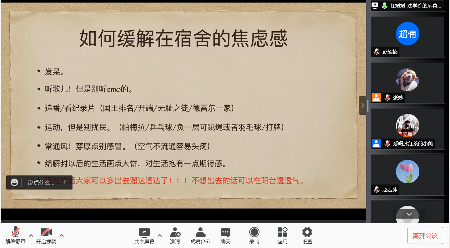 接下来,生活委员任媛媛同学进行了疫情下心理辅导专题培训,她分析了当前疫情下大家可能出现的几种情绪,讲述了如何缓解久居宿舍的焦虑感的具体方法,结合自己的经验总结出加强时间管理的小妙招。同学们纷纷表示通过本次培训提升了在疫情环境下的自我心理调节能力,为同学们保持自身心理健康提供了支持和帮助。