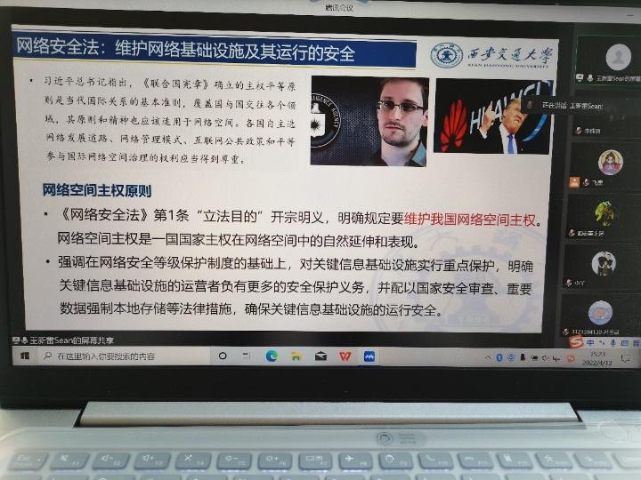 4月13日,法学院组织各党支部一同观看西安交通大学全民国家安全教育普法讲座。由于疫情原因,本次讲座采取线上模式。讲座中,王新雷老师对“新时代我国数据安全、隐私保护的法律成就与个人担当”这一专题进行详细讲解,各位同学都获益匪浅。