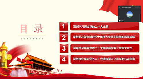 首先,由张乃钟老师作以“贯彻落实二十大精神,做新时代青年人”为主题的宣讲报告,从四个方面分享了她学习二十大精神的学习心得。第一,深刻学习领会党的二十大主题。党的二十大主题是大会的灵魂,是党和国家事业发展的总纲,八十六个字,字字千钧,内涵丰富,思想深刻,意义深远。党的二十大确立这一主题,其目的是鼓舞全党和全国各族人民,勇于变革,勇于创新,万众一心,团结奋斗,奋力开创社会主义现代化建设的新局面。第二,深刻学习领会新时代十年伟大变革中取得的辉煌成就。二十大报告回顾总结了过去五年的工作和新时代十年的伟大变革,展望全面建成社会主义现代化国家新征程,阐述了开辟马克思主义中国化时代新境界,中国式现代化的中国特色和本质要求等重大问题。第三,深刻学习领会党的二十大精神蕴含的三重重大意义。党的二十大精神具有重大的理论意义、时代意义、实践意义。第四,深刻领会学习党的二十大精神是开创未来的行动指南。习近平总书记在党的二十大报告中强调全党同志务必不忘初心、牢记使命,务必谦虚谨慎、艰苦奋斗,务必敢于斗争、善于斗争,坚定历史自信,增强历史主动,谱写新时代中国特色社会主义更加绚丽的华章。三个务必展示了中国共产党人自警自立的政治智慧和求真务实的政治品格。报告的最后,张老师对大家提出了三点希望。第一,主动实现个人价值,树立正确的世界观、人生观、价值观。第二,青年强则国强,要肩负起时代赋予我们的责任。第三,作为青年,要有“功成必定有我”的责任担当,青年有多好,中国就有多好。