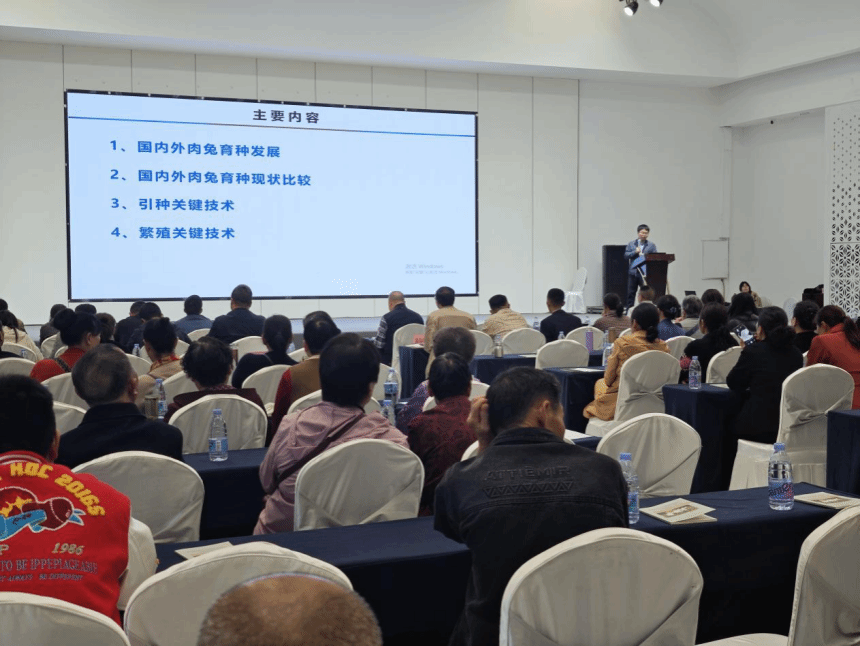会上,孙文强系统讲解了国内外肉兔育种发展历程与现状差异,重点分析了欧洲选育、遗传评估及人工授精等方面的先进经验,并结合我国肉兔产业发展实际,深入阐述了优质种兔需求趋势与自主育种体系建设路径。孙文强结合生产实践,从引种前的品种选择,到引种过程中的健康筛查,再到引种后的种兔培育等方面进行了系统梳理,为养殖主体提供了可操作性强的技术指导。