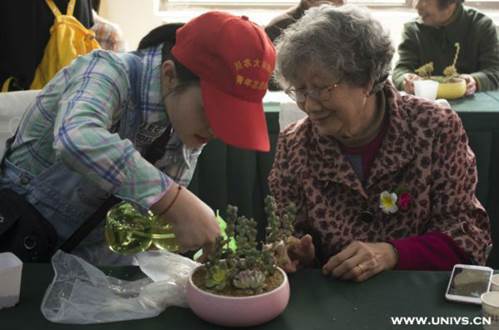 “先将一部分土倒在花盆里面,再将装在器皿中的多肉移栽到花盆中,铺上另一部土后,加一点水,铺上石子就行了。”志愿者刘琦君为老人们介绍如何移栽多肉的场景如是说。