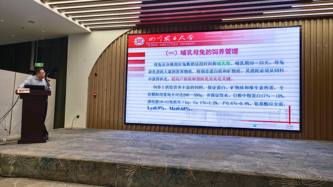 培训会上,赖松家教授围绕哺乳母兔的科学饲养管理进行了系统讲解,内容涵盖了母兔妊娠期及哺乳期的营养需求、饲喂策略、环境控制、仔兔成活率提升措施等关键技术点。赖教授结合实际案例和常见问题,深入浅出地讲解并指导参训人员掌握母兔高效繁殖与仔兔健康生长的核心要领。