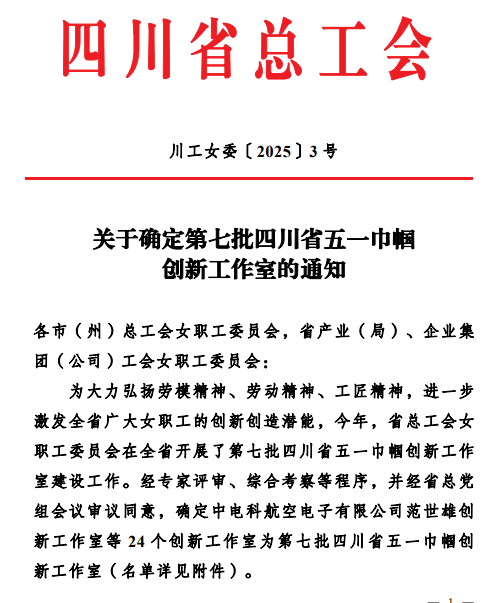 日前,四川省总工会发文(川工女委〔2025〕3 号),确认我院“赵小玲创新工作室”入选第七批四川省五一巾帼创新工作室。