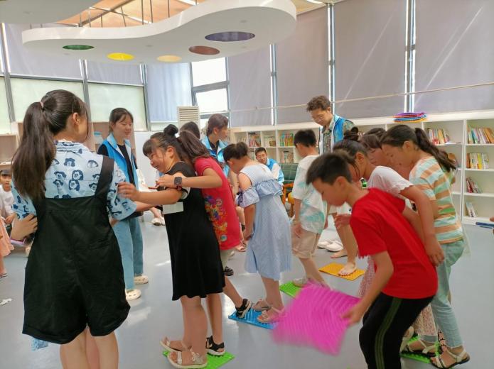 随后,张老带领小朋友们认真回顾了红军长征的背景和过程,现场播放了若干与长征有关的视频,再现了长征的艰苦场景,向小朋友们展示了红军长征胜利的来之不易。之后,张老为孩子们延伸讲述了红军长征途中的许多感人故事,并围绕半截皮带的故事做了一首打油诗,“牛皮腰带三尺长,草地荒原好干粮,开水煮来别有味,野火烧熟味更香,一半用来煮野菜,一半用来熬鲜汤,有汤有菜花样多,留下一半战友尝。”被孩子们自发大声诵读了出来。最后张老详细为小朋友的剖析了长征精神,呼吁大家要胸怀理想和报国之心,在以后的学习中发奋图强,建设美丽中国。随后,志愿者们还组织小朋友7人一组,有序参与了“指压板过草地”的游戏,切实让孩子们体验红军长征中的万般艰苦