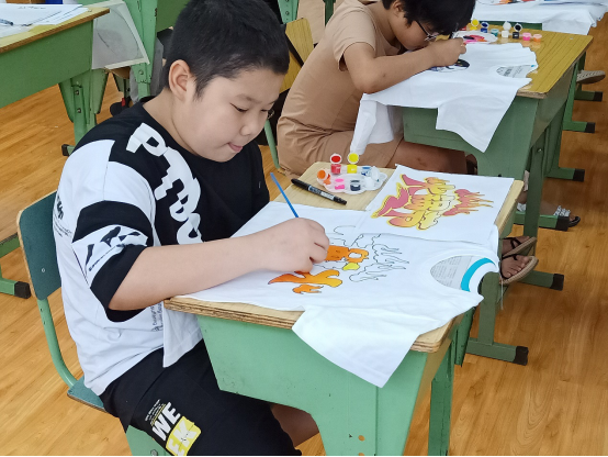 半小时后到了绘画环节,志愿者帮助老师发放要用到的工具:白T恤、记号笔、丙烯颜料、铅笔、特殊图纸、笔刷、小水桶、颜料盘、报纸等。先在附有图案的纸上描图,插好图后撕下,在衣服上用笔勾勒出线条,使铅笔的碳粉印在衣服上,再用记号笔在衣服上给图案勾边,最后用颜料调色并按图纸给衣服上的图案上色。在志愿者的帮助下,所有小朋友都完成了主要内容的绘画。