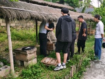 烈日当空的下午,20余个蜂箱整整齐齐地排列在蜂场两侧,蜜蜂却很少见。杨教授走到蜂箱前,缓缓地,轻轻地一层一层地打开蜂箱。刚打开蜂箱,工蜂们立刻出动,环绕在蜂箱附近,宛如一团黑黄色的雾。见队员们离得比较远,杨教授笑着说到:“想要做好,一定要去自己实地看看!”说着他慢慢举起爬满蜜蜂的巢框,“这种蜂子蛰人不用怕嘛,当地有种蜂疗,就是用这个,可以治风湿哦!”队员们渐渐被感染,帮着杨老师一个一个打开蜂箱,按着技术手册上,学习如何检查蜂王是否健康、蜂蜜残余量是否足够、巢脾好不好等等。确认当地的蜂箱都安全无误后,杨老师和队员们又调研了当地蜂民养蜂的一些现状和担心的问题。“这个中蜂啊,象征着勤劳,而我们的村民,正是一群勤劳、肯吃苦的人。我相信,我们一定可以做好!蜂蜜一定可以带动我们当地经济的发展!”万源市养蜂协会的负责人杨毅感慨地说道。