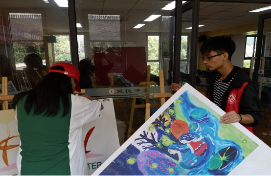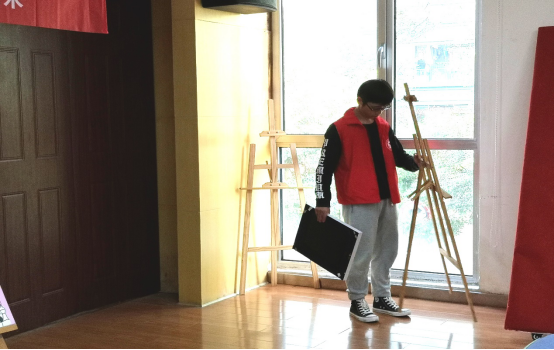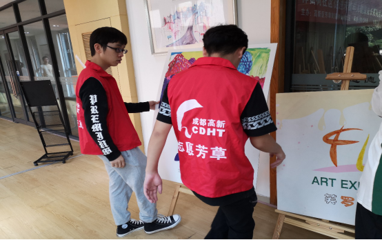 由于社区离学校较远,志愿者们在7:20时便从学校出发,前往社区。在9点时,到达了社区,负责人领着志愿者们进到了社区活动馆中。为了能够让家长们更加方便的看到画作,志愿者们去仓库中搬来了支架。在9:20时,为了引导那些不知道路的家长,志愿者们被安排到了活动馆的各处。