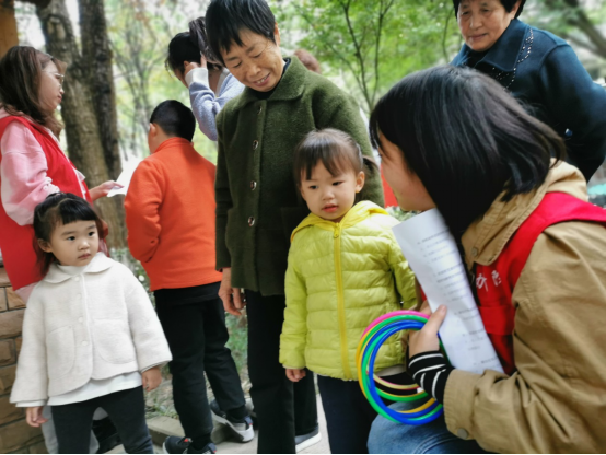 图为志愿者带着社区老人参与套圈游戏