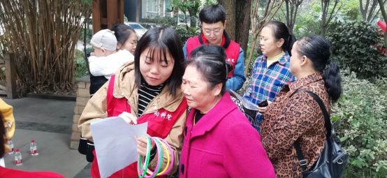 图为志愿者给老人科普知识