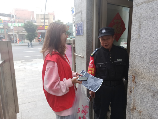 图为志愿者为保安叔叔讲解交通安全知识
