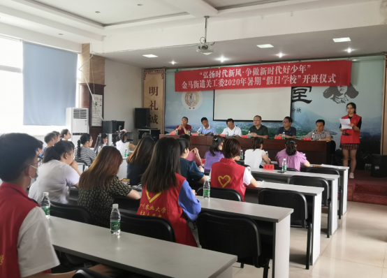 7月20日上午9点,由金马街道关工委、团工委主办,四川农业大学动物科技学院团委青年志愿者工作部参与协办的以“弘扬时代新风,争做新时代好少年”为主题的暑期假日学校正式开班了。此次开班仪式邀请到了金马街道关工委执行主任、金马街道党工委副书记、关工委主任、区关工委领导作为开班仪式的嘉宾,金马消防队杨智彬老师作为安全知识宣讲嘉宾,进行安全教育课的讲授。