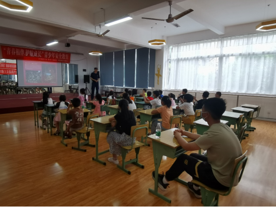 仪式结束后,由杨智彬老师进行安全知识宣讲。杨老师主要讲解了一些浅显易懂、应知应会的消防安全知识,如火灾预防知识、报警方法、简单的灭火常识以及火场逃生知识等,并且结合真实案例生动有趣地讲述了一些有关安全通道的知识。在讲解的过程当中,小朋友们认真听讲,杨老师也会提出一些常见的消防安全知识问题让小朋友们回答,如报警电话是什么、当发现起火时第一反应应该做什么等等。小朋友均积极参与,课堂气氛活跃,回答问题过后杨老师也及时对小朋友做出了表扬。在宣讲的尾声,杨老师对所讲知识点的重要性进行了强调,杨老师指出:与会的孩子正处于中小学阶段,中小学生人员密度较大,管理漏洞多,学生的消防安全意识也比较薄弱,所以针对其特点,学校、家庭、社区应该要将这些知识及时地传输给他们,让孩子们具备基本的火灾防御能力。